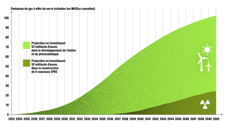 Pour des besoins immédiats en électricité : multiplier par 2 les ENR devenues »rentables et compétitives », 5o parcs éoliens en mer soit 40GW en 2050, multiplier par 10 le photovoltaïque (« l’énergie…la moins chère »)